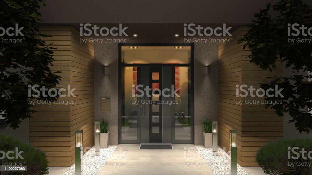 3D rendering of a modern home enttrance with front door and yard illuminated by night