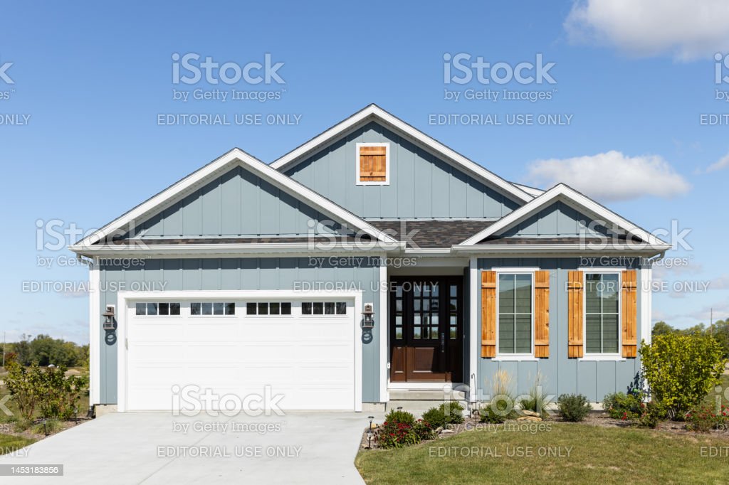Elmhurst, IL, USA – September 25, 2022: A light blue ranch home with a two car garage, wood window shutters, vertical siding, and a dark wood front door.